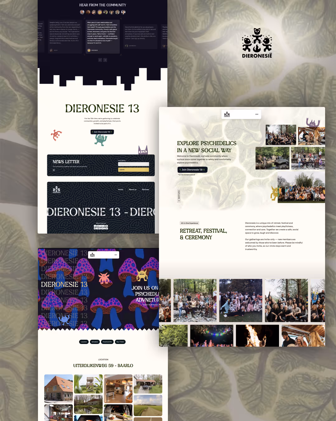 Diersonesie is a vibrant psychedelic community that hosts retreats, festivals, and ceremonies. After attending and volunteering at several of their events, I developed a deep connection with the people and the mission. That bond naturally evolved into a new role—becoming the tech wiz behind the scenes, on a mission to create a digital experience that truly captures the spirit and playfulness of the Diersonesie community.